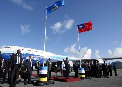 經過3小時40分的飛行,專機在聖露西亞時間15日下午3時30分(台北時間16日凌晨3時30分)抵達聖露西亞南部Hewanorra國際機場,總統在我駐聖露西亞大使周台竹及聖國禮賓司長Martha Auguste 恭迎下由外交部部長黃志芳及總統府副秘書長林佳龍陪同步出機門揮手向歡迎人員致意,並由聖國總理金恩(Stephenson King)陪同步向觀禮台。歡迎儀式開始,首先演奏台聖兩國國歌,繼由檢閱官恭引總統及金恩總理檢閱聖國榮譽儀隊後,再度演奏兩國國歌,接著欣賞聖國兒童文化表演。可愛但有點靦腆的聖國兒童,以稚嫩的嗓音唱著歡迎歌曲,期間更以國語唱出「歡迎、歡迎,歡迎來到聖露西亞」,氣氛相當溫馨感人。
