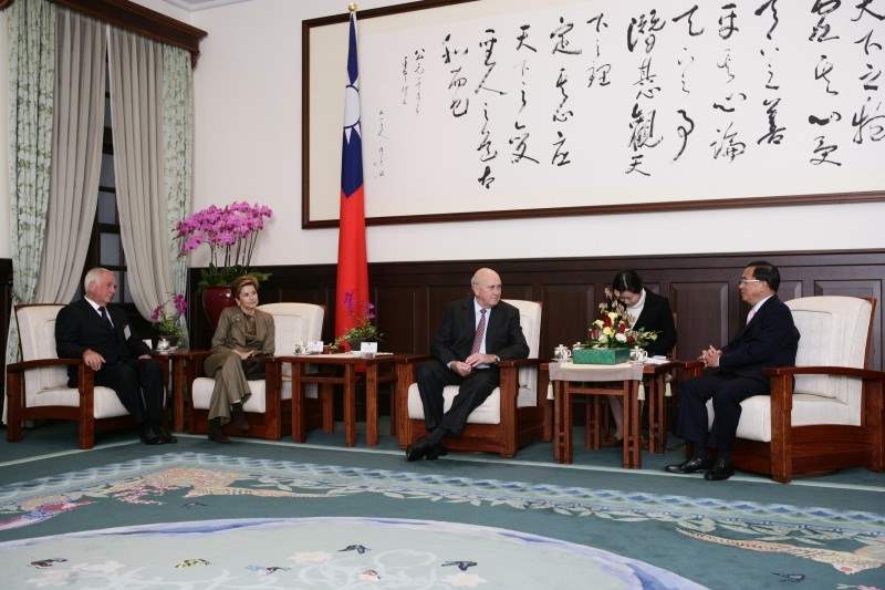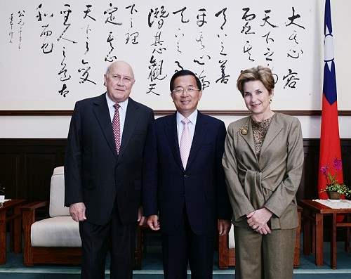 南非前總統戴克拉克今天下午由外交部次長朱玉鳳陪同,前來總統府晉見總統,總統府副秘書長林佳龍也在座。
