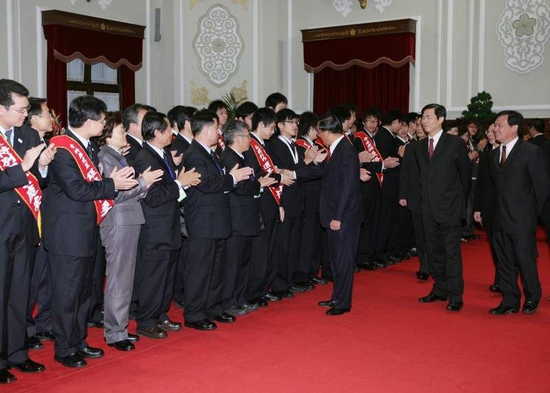 今天非常高興能夠在總統府和大家歡聚一堂,這次各位到日本參加「國際技能競賽暨國際展能節技能競賽」獲得優異的成績,在此除了要代表政府與人民對各位在比賽中的傑出表現致上由衷的祝賀之外,也要對這次參加提名、培訓及贊助選手的各相關單位所付出的辛勞與努力,表達肯定與感謝之意。各位經過多年辛苦的紮實訓練,不但練就了精湛的技能,更在激烈的競爭中最後脫穎而出,各位綻放的光芒,讓世界看到了台灣。
