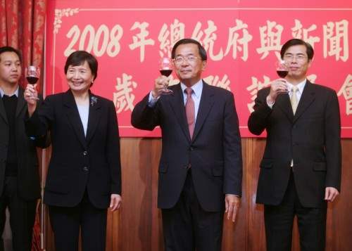 陳總統水扁先生今天中午在台北賓館參加97年總統府與新聞媒體歲末聯誼餐會,向記者媒體朋友拜早年,並祝福他們鼠年吉祥、萬事如意、新春愉快、闔家平安。