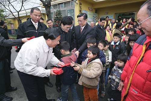 隨後,在參訪內政部兒童之家時,總統在內政部部長李逸洋陪同下步入大禮堂,可愛的院童們大聲高喊「總統爺爺好」,向總統表達熱切的歡迎之意。總統也一一發放紅包給他們,祝賀新年快樂;由於院童中也有小嬰孩,總統抱著他,一起與大家合影留念,現場氣氛既喜慶又溫馨。