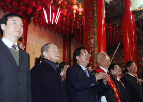 陳總統水扁先生今天下午在內政部部長李逸洋陪同下,出席基隆市天顯宮五福財神聖誕典禮,上香參拜祈求台灣國泰民安、風調雨順,2,300萬台灣人民都能平安健康、幸福安樂。