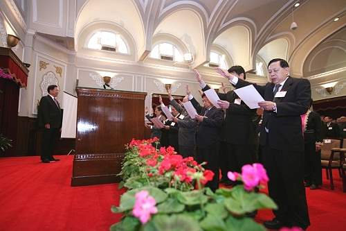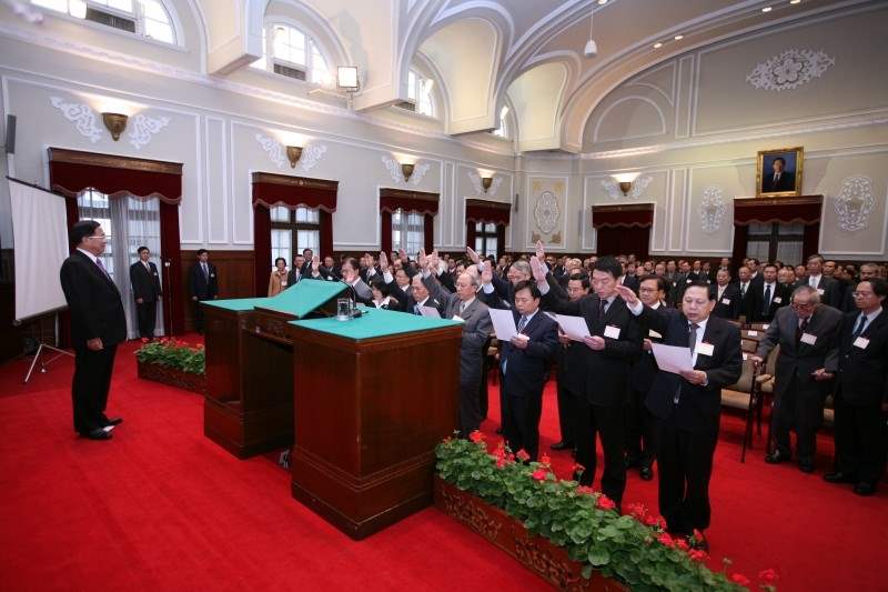 在唱國歌及向國旗暨國父遺像行三鞠躬禮後,首先舉行宣誓儀式,宣誓人在總統監誓下宣讀誓詞,儀式莊嚴隆重。隨後,林信義董事長以「創新加值與競爭力」為題,進行專題報告。