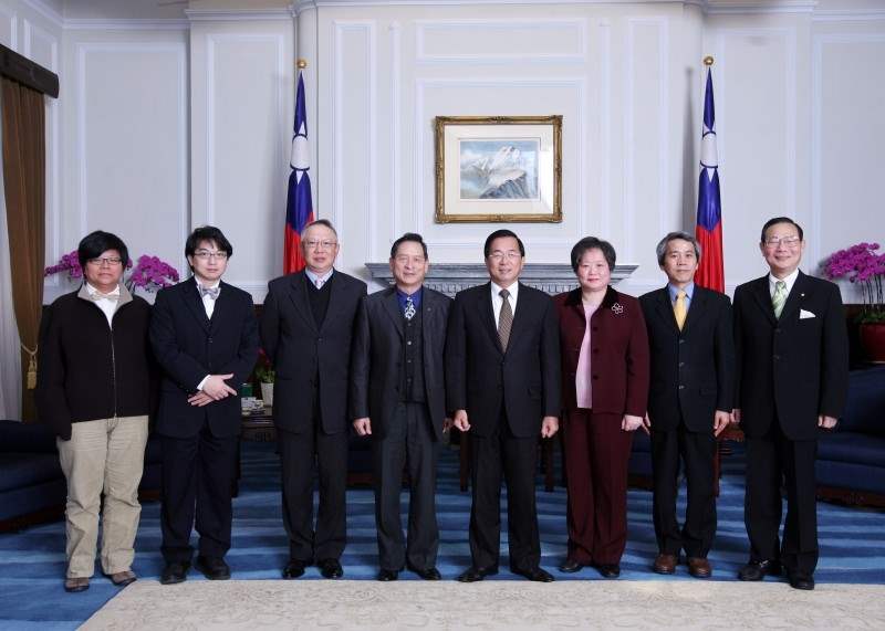 得獎人陳銀河、薛昭信、蘇重威及姜樂靜等四位建築師上午由內政部次長林美珠陪同,前來總統府晉見總統,總統府副秘書長陳其邁也在座。