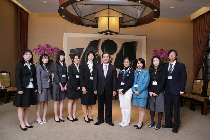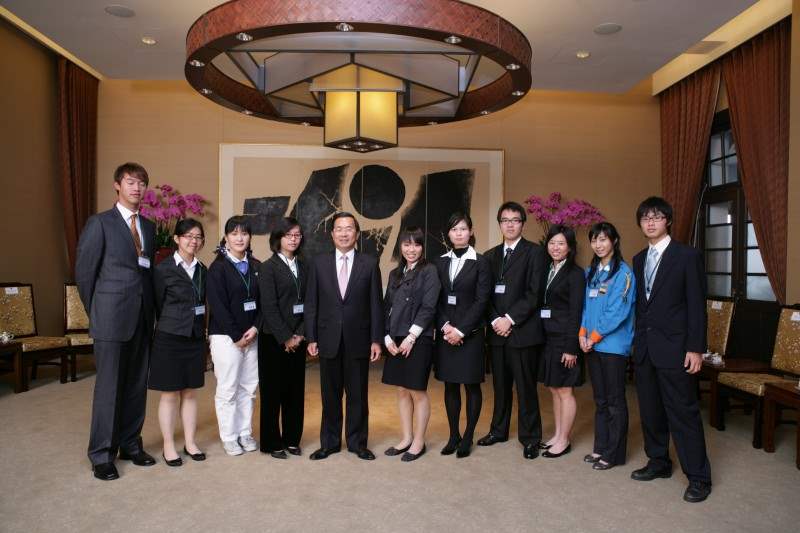 得獎社團代表梁佳芬、張靜芳、呂建勳、吳竹貴、洪如芳、游書豪、莊梓昱、徐艾平、謝瑩瑩、高子閔及社團領袖蔡宜婷、吳詩涵、陳美磬、邱暉齊、高翊齡、宗念臻、謝宜潔、孫潔芮、鄭晴文等同學上午由內政部次長林美珠、國際傑人會中華民國總會第16、17屆總會長陳義聰及楊慶祥陪同,前來總統府接受總統祝賀,總統府副秘書長陳其邁也在座。