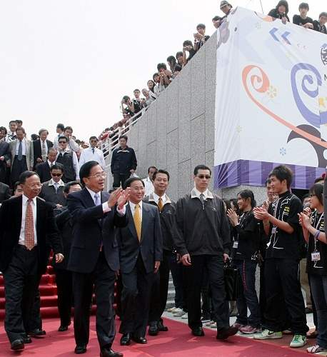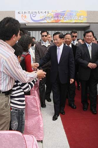 陳總統水扁先生今天上午南下嘉義縣新港鄉參加國立新港藝術高級中學校舍落成啟用典禮,在欣賞布農族八部合音之後,總統以堆積木的方式放置行政大樓模型,隨後並致詞。