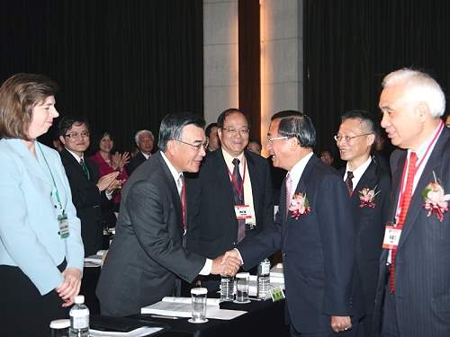 在座的各位,都是來自海內外的產業科技菁英,各位的專業知識、經驗與建議,是創造台灣競爭力、台灣產業升級、經濟蓬勃發展的最重要推手。期許大家能繼續為政府發展產業科技的重點政策方向,提出指教與建議,希望能讓台灣的產業科技實力在國際上躍居領先的地位,也希望大家繼續本著「全球思考、在地行動」的研發願景,不畏艱難、勇往直前,為台灣高科技產業的創新與發展共同打拼。