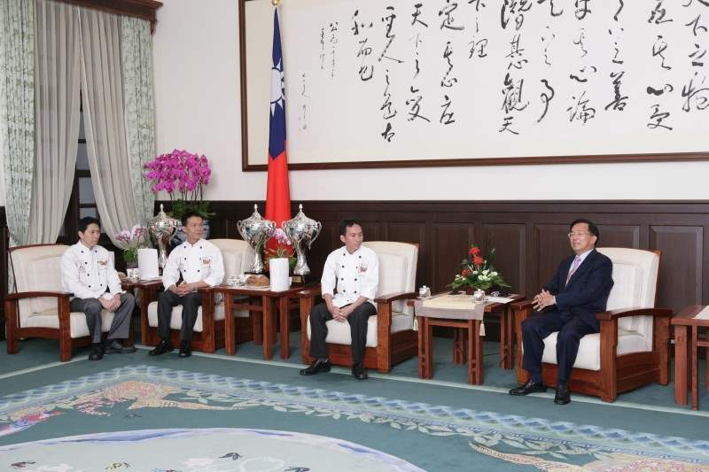 「世界麵包大賽」台灣代表隊下午由教練施坤河帶領,前來總統府晉見總統,總統府副秘書長陳其邁也在座。