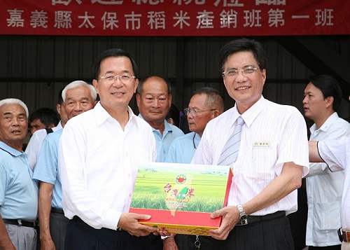 陳總統水扁先生今天下午前往嘉義縣太保市參訪「太保有機米產銷班」,除聽取農會人員解說之外,並致詞肯定農民以創意頭腦結合科技,為台灣米成功立下新基礎與生命力。