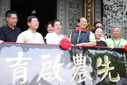 稍早,總統前往嘉義縣水上鄉大崙社區新興宮參拜,並贈予廟方題有「先農啟育」字樣的牌匾;隨後,總統也參訪5號公園,並親自試踏水車,也參訪社區的老柑仔店,象徵對政府保存傳統社區商圈文化的關心與重視。