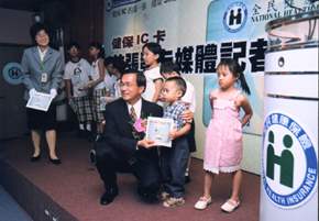 今天阿扁很高興來這裡當起「接生婆」,和大家一起來迎接健保IC卡的誕生。健保IC卡的正式發行,代表著台灣醫療體系正式跨入了E世代,未來透過健保IC卡的運用,將有助醫療資訊的整合、減少醫療浪費,並促進醫療服務品質的提升。