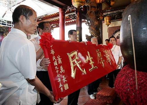 由三重市長李乾龍陪同,副總統擔任主祭官,在上香、獻花、獻壽桃、獻果後,副總統代表馬總統及以自己名義分別致贈「福裕德澤」及「澤厚民生」匾額各乙幀,祈求在神農大帝保佑下,國人閤家平安,國家進步發展。