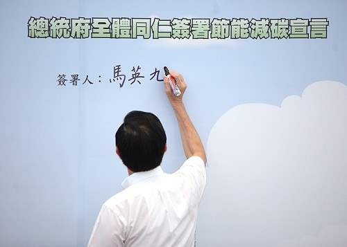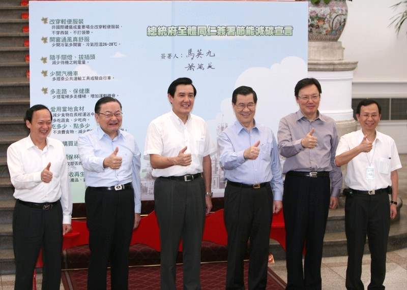 馬英九總統與蕭萬長副總統今天下午在總統府秘書長詹春柏、國家安全會議秘書長蘇起、總統府副秘書長葉金川、環境保護署署長沈世宏的陪同下,出席在總統府舉辦的「總統府全體同仁簽署節能減碳宣言」活動,除宣揚節能減碳的環保理念以外,也期勉總統府同仁能身體力行,為環境保護盡一份心力。