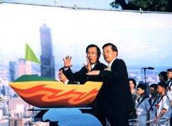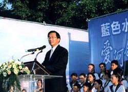 今天阿扁很高興來到高雄最美的地方共同主持這項歷史性任務「藍色水路-愛河全線通水大典」。愛河是高雄港都的地標,站在這裡,咱看到高雄無窮的希望,也看到高雄美麗的未來。