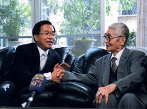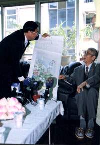 總統也說,今年四月份他分二梯次邀請高齡一○○歲的前輩畫家到官邸小聚,每梯次五人,共十人,歲數加起來剛好是「千歲」,如郭雪湖、林玉山、陳慧坤等前輩都撥冗出席,可惜吳老先生不克前來,實在是美中不足的事,總統也希望吳老先生有機會能到官邸坐坐、走走。