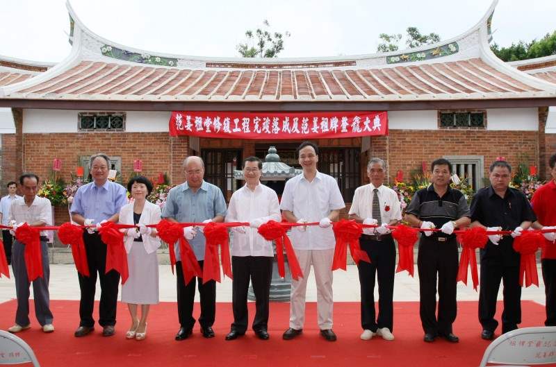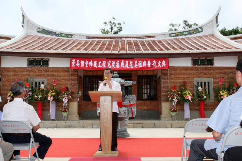 蕭萬長副總統今天上午出席桃園新屋范姜祖堂修復工程完竣落成及范姜祖牌登竈大典,除表達衷心賀意,並期許修復後的祖堂能成為桃園地區一個集文化、教育與觀光多功能的重要地方指標。