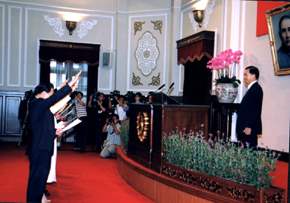 月會開始,首先舉行宣誓典禮,宣誓人司法院大法官賴英照、行政院秘書長劉世芳、北美事務協調委員會主任委員吳子丹、駐哥斯大黎加共和國特命全權大使王飛、駐塞內加爾共和國特命全權大使黃允哲、行政院衛生署副署長涂醒哲等人,在總統監誓下,面對國旗、國父遺像,高舉右手,宣讀誓詞。儀式莊嚴隆重。