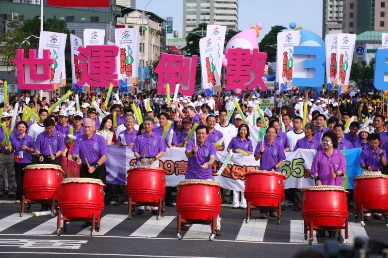 總統致詞後,並與高雄市長陳菊、世界運動會國際總會主席Ron Froehlich會長及我國國際奧會委員吳經國等貴賓一起擊鼓,為2009年世運造勢大遊行開場。