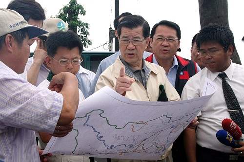 上午10時許,副總統首先來到高雄縣大社鄉勘察中圳溪護岸坍方現地,在聽取經濟部水利署簡報及地方政府與人士解說後,副總統表示,這次水患造成高雄縣多處災損,讓人憂心,因為這是攸關國人民生的重大議題,而河川的整治必須做好整體規劃,中央與地方政府皆責無旁貸,一定要彼此攜手合作,除了加強相關預算的編列,更要把防洪治水列為首要施政項目。