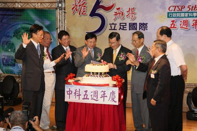 蕭萬長副總統今天上午在行政院院長劉兆玄陪同下前往台中參加中科管理局五週年慶祝活動,除應邀致詞、頒獎予創新產品得獎廠商,並與劉院長、國科會主委李羅權等共同主持切蛋糕儀式,祝福中科五週年生日快樂,未來持續穩健地進步發展。