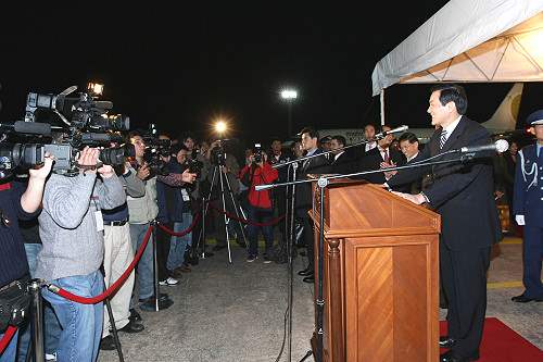 這是我第一次到巴拉圭來訪問,這麼晚的時間還有這麼多的朋友來歡迎我,讓我非常感動。中華民國與巴拉圭兩個國家建交51年,邦交非常深厚穩固,這次我們來是參加巴拉圭新任總統盧戈的就職典禮,也希望藉這個機會能夠促使雙方邦誼更加鞏固。當然我也要會見杜華德總統,他過去兩度訪問台灣,我們陳前總統與呂副總統也曾經兩度到巴拉圭訪問,雙方互動往來非常密切。