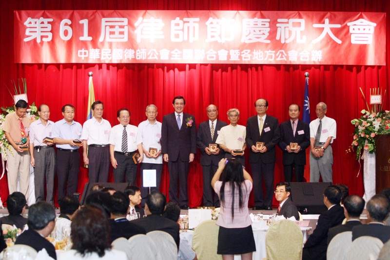 馬英九總統今天上午專程前往台南,參加由中華民國律師公會全國聯合會暨各地方公會聯合舉辦的「第61屆律師節慶祝大會」,會中並頒發獎座給資深會員及會務特殊貢獻獎等獲獎人員。