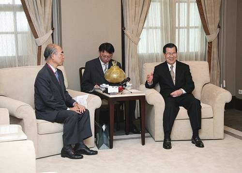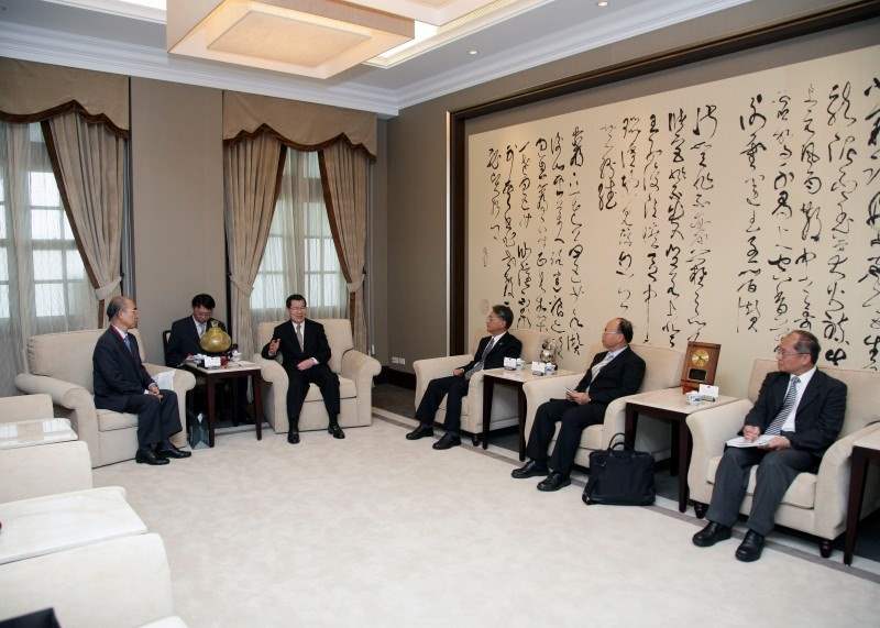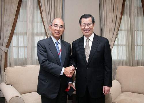 日本財團法人工業所有權協力中心理事長岡松壯三郎,下午是由亞東關係協會產業科技交流委員會主任委員蔡清彥等人陪同,前來總統府拜會副總統。