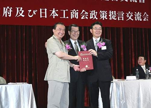 蕭萬長副總統今天下午出席「中華民國政府與日本工商會政策建言交流會」,除應邀致詞,並見證「台北市日本工商會」理事長坂井賢司(Sakai Kenji)呈贈建言書予我經濟部長尹啟銘。