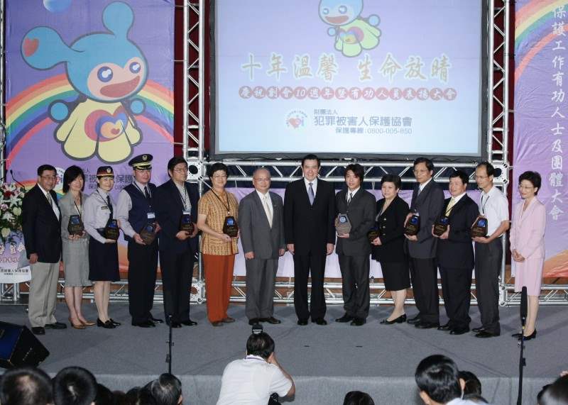馬英九總統今天下午前往法務部出席「十年溫馨 生命放晴」-犯罪被害人保護協會創會10週年慶,並親自頒獎表揚推動犯罪被害人保護工作有功人士與團體,希望他們能愈做愈好,照顧更多需要關懷的犯罪被害人。