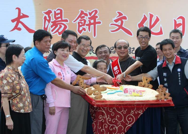 在出席台中公園太陽餅文化日活動時,迎著台中燦爛的陽光,副總統與台中鄉親共同歡喜迎接太陽餅日的到來,並在胡志強市長的陪同下,共同主持餅香獻禮儀式,切開大型太陽餅,將餅香與現場所有鄉親分享。