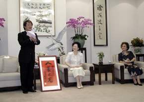 隨後,副總統也在總統府接見由太極門掌門人洪道子所率領的「世界之愛和平親善文化訪問團」,除肯定他們繼陳總統訪問非洲友邦之後,將展開為期二十天的「二○○二年非洲和平文化行」,宣揚台灣和平與愛的信念外,也親自為訪團授旗,祝福他們訪問順利成功。