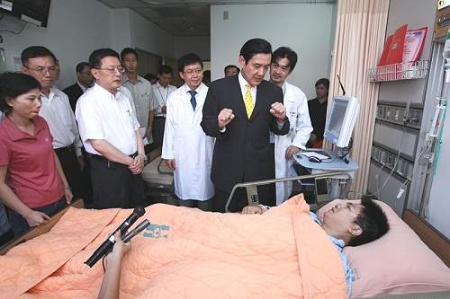 馬英九總統今天下午前往台北市新光醫院探視因處理昨天群眾街頭抗爭事件負傷的執勤員警項自強、廖瑞隆,並致贈慰問金;總統也特別感謝警察同仁昨天在維護台北市治安的辛勞與奉獻。