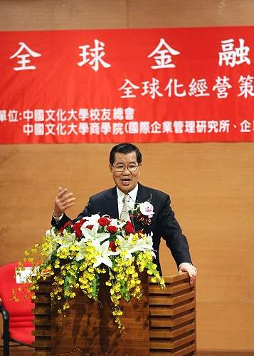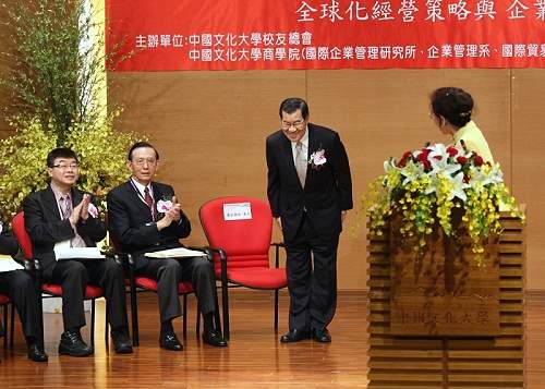 副總統致詞時表示,文化大學企業研究所長期在促成國際人才來台交流,貢獻頗著,不僅鼓勵了國內企業界與國際接軌,同時有助我外交工作,他要代表政府表達衷心的敬意與謝忱。