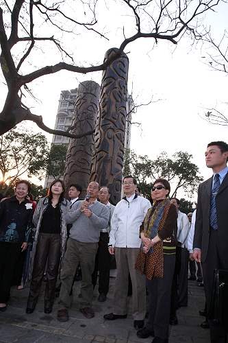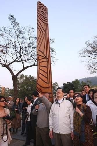 副總統伉儷在吳炫三大師的陪同與親自解說下,一一觀賞刻正在官邸公園展出的大型雕塑作品,對聳立在公園各處,氣勢磅礡、充滿原始風格的件件雕刻藝品,副總統仔細聆聽說明,並表達了對台灣推廣文化創意產業的期勉與展望。