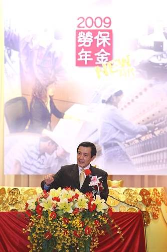 馬英九總統今天下午前往台北市國軍英雄館參加勞保年金開辦典禮,對於勞保年金將於明天正式實施,他的競選政見因此又實現了一個,能讓200萬勞工受惠,對此他特別表達欣慰之意。