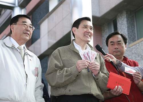 馬英九總統今天上午前往台北市文山區戶籍所在地消費券發放所,與民眾一同依序排隊,親自領取他與家人的消費券,面額共計14400元。