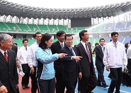 在結束與產業界座談後,副總統前往2009世運會主場館參觀。在聽取高雄市政府工務局吳宏謀局長所作的簡報後,副總統致詞表示,世運會主場館是全台灣第一座綠建築運動場,不但是高雄人的福氣,也是台灣人的驕傲。