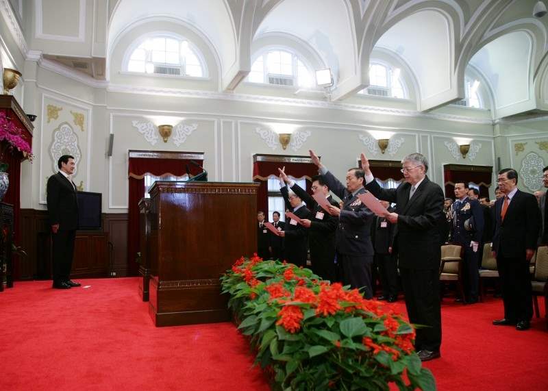 在唱國歌及向國旗暨國父遺像行三鞠躬禮後,首先舉行宣誓儀式,宣誓人行政院政務委員薛承泰、行政院新聞局局長蘇俊賓、國防部副部長趙世璋、中央研究院副院長劉兆漢在總統監誓下宣讀誓詞,儀式莊嚴隆重。