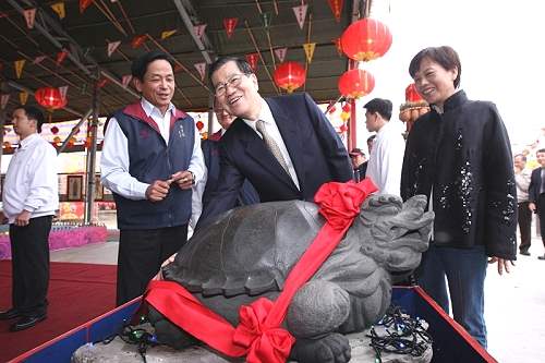 座談會後,副總統前往海靈殿參香祈福,祈願國泰民安、風調雨順。副總統在殿前一尊龍頭龜身石像前稍為駐足,聽取石像由來,也默祝台灣儘速像像神龍一樣騰躍,像海龜一樣生生不息、長長久久。