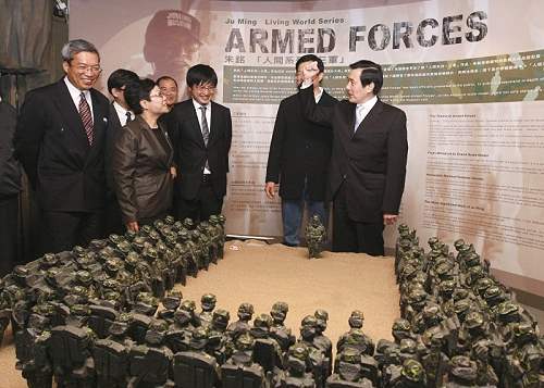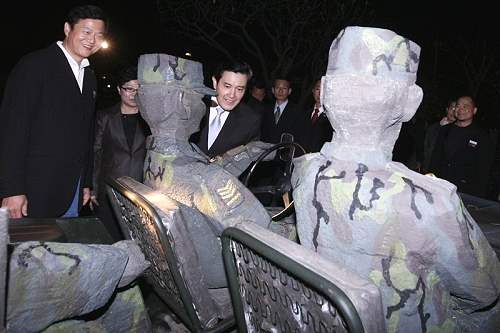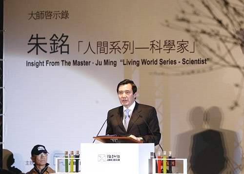 馬英九總統今天晚間在台北縣金山鄉朱銘美術館科學園區為雕刻大師朱銘「人間系列-科學家」新作揭幕。