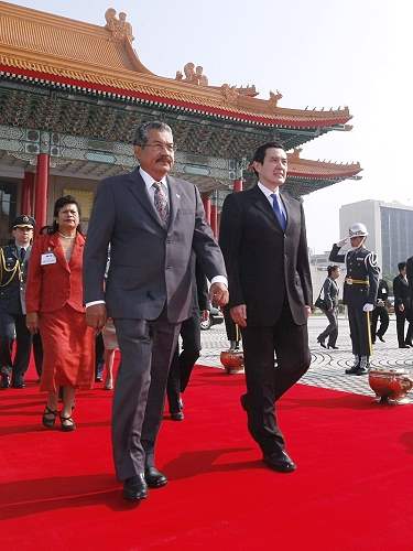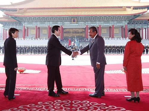 馬英九總統伉儷今天上午以隆重軍禮歡迎率團來台訪問的帛琉共和國總統陶瑞賓(Johnson Toribiong)伉儷。