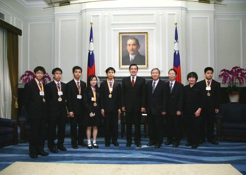 第五屆國際國中科學奧林匹亞競賽代表團得獎學生趙翎雅、童宇鴻、黃柏瑋、陳佑詳、徐子旻、吳冠融,及教練洪志明、施華強、羅珮華,下午由教育部長鄭瑞城陪同,前來總統府接受總統道賀。總統府副秘書長賴峰偉也在座。