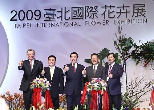 馬英九總統今天上午出席「2010台北國際花卉博覽會系列活動-2009台北國際花卉展覽」開幕儀式,並在致詞後與台北市長郝龍斌、行政院農委會主任委員陳武雄、台灣區花卉發展協會董事長郭正和及國際園藝生產者協會(AIPH)主席Doeke Faber共同剪綵。