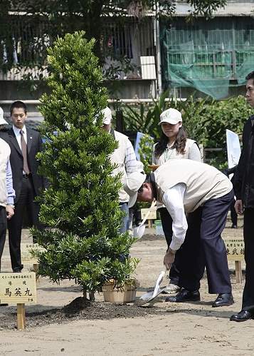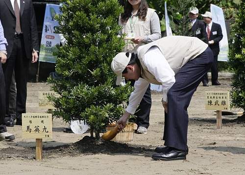 馬英九總統今天上午偕同蕭萬長副總統、行政院劉兆玄院長、考試院關中院長及監察院王建煊院長,共同出席在國家文官培訓所舉行的98年植樹月-中樞紀念植樹活動「森情滿台灣」,在致詞後種下具有堅強生命力的蘭嶼羅漢松,以彰顯人才培育及植樹造林的重要性。