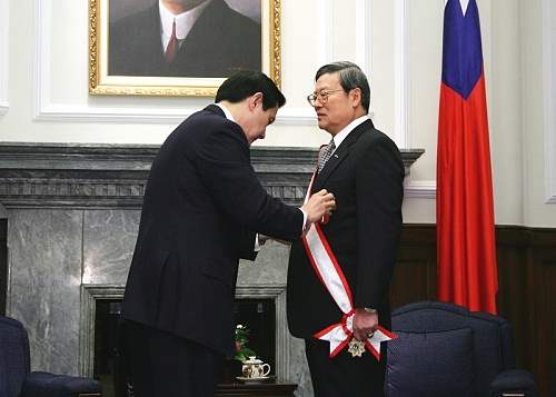 馬英九總統今天上午代表我國政府與人民頒贈國家安全局前局長蔡朝明「二等雲麾勳章」,以表彰他對國家的卓著勳績與貢獻。