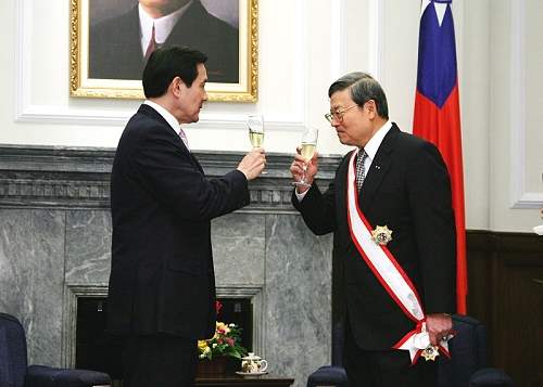 授勳儀式在禮官宣讀頌詞後,總統為蔡前局長佩掛綬帶與勳章,並握手致賀,繼由受勳人致謝詞。隨後,總統與蔡前局長舉杯互祝,在場觀禮人員也趨前敬酒表達賀意。