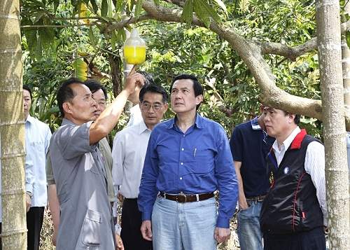 下午總統首先前往竹崎鄉視察果實蠅防治成效,並與農民座談。總統在聽取簡報後表示,蟲害問題一直是果農們最大的困擾,他希望農委會能參酌農民反映的問題,輔以科學方法,一併考量成本與效果等問題,提出評估方案。