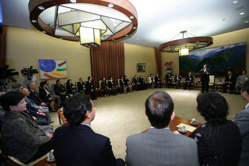 東京中山學會暨日本僑領返國致敬團團長謝文政等人,下午由僑委會副委員長薛盛華陪同,前來總統府晉見總統。總統府副秘書長賴峰偉也在座。