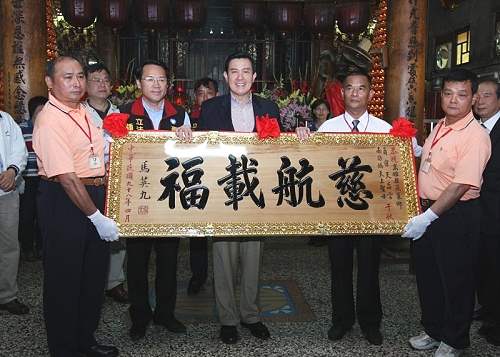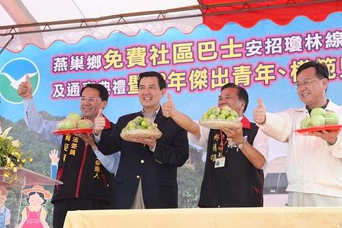 結束義大醫院行程後,總統前往燕巢鄉天后宮參香祈福並贈匾,祈願國泰民安、風調雨順。隨後總統前往燕巢鄉出席免費社區巴士贈車、通車典禮,並親自為當地特產的芭樂與甜棗代言,隨後與民眾及模範兒童合影留念。