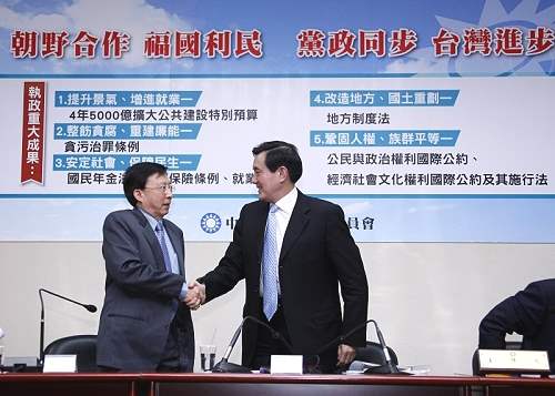 總統也希望行政與立法部門能加緊合作,通過更多重要的法案,例如攸關地方制度法的「財政收支劃分法」、深受企業界重視的「公司法」修正案、調降營利事業所得稅法的修正案、「兩岸人民關係條例」修正案、中選會組織法修正案,以及將集會遊行法由原則許可制改為報備制,這些都是攸關我國政治、經濟與社會長遠發展的重要法案。